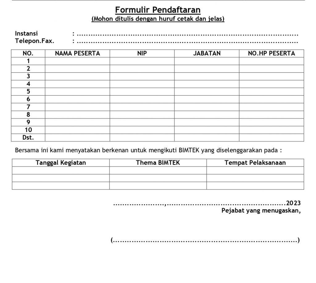 SILAKAN DOWNLOAD FORMULIR KIRIM KE :devi_yulie@yahoo.co.id ATAU WA : 0812 6072 972 ATAU LANGSUNG ISIKAN IDENTITAS PESERTA BERIKUT: THEMA BIMTEK SILAKAN MENUJU KE HALAMAN THEMA BIMTEK PUSDIKLATNAS THEMA BIMTEK LKKN Notice: JavaScript is required for this content.